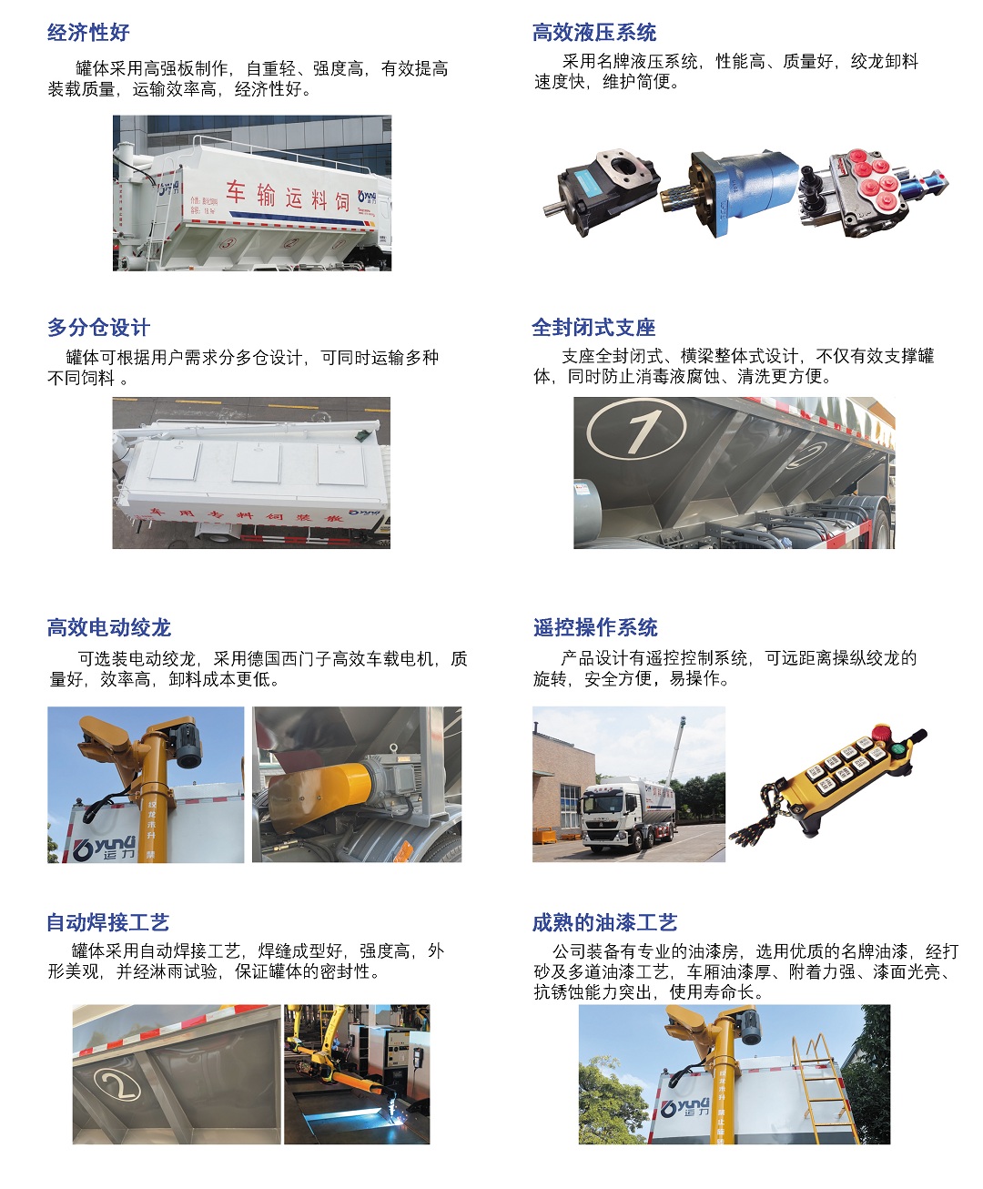 運力牌散裝飼料運輸車,采用三維設(shè)計技術(shù),罐體采用高強度板材制作,自重輕、強度高、重心低。罐體多倉設(shè)計,可同時裝載多種飼料;經(jīng)淋雨試驗,密封性好,保障飼料不受污染。采用國際名牌液壓系統(tǒng),質(zhì)量好,維護簡便。可根據(jù)用戶需要選裝電動絞龍,更加經(jīng)濟節(jié)能。